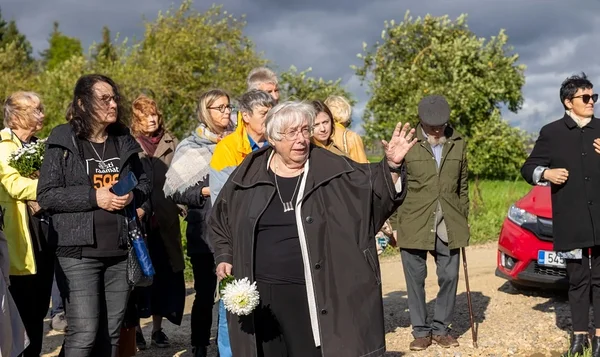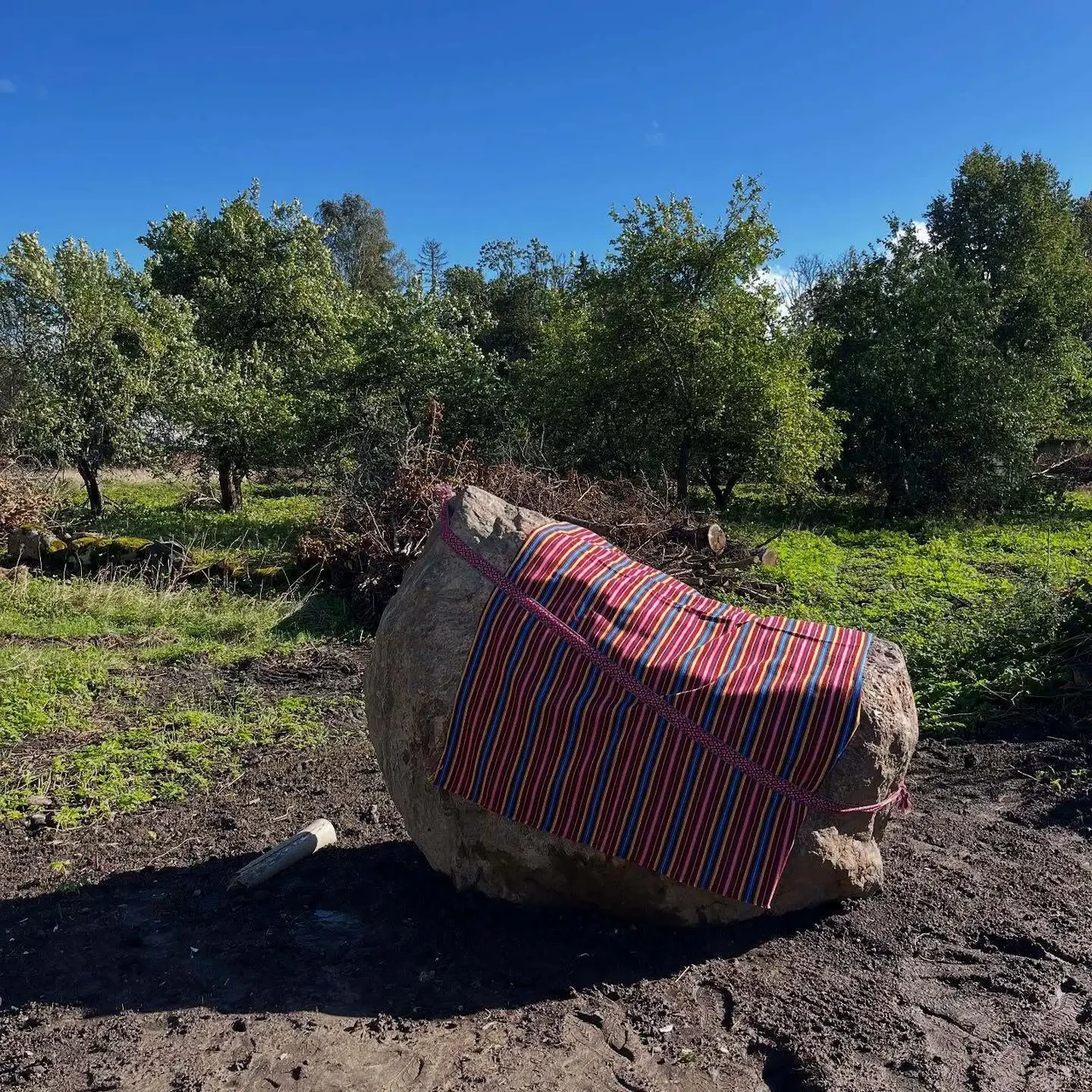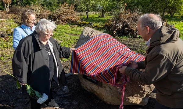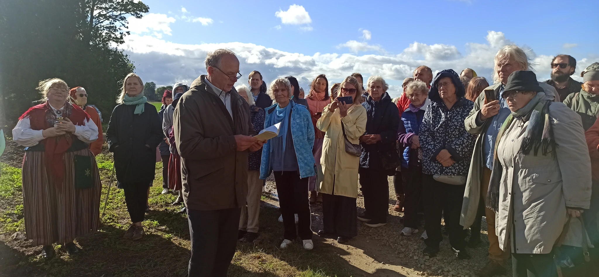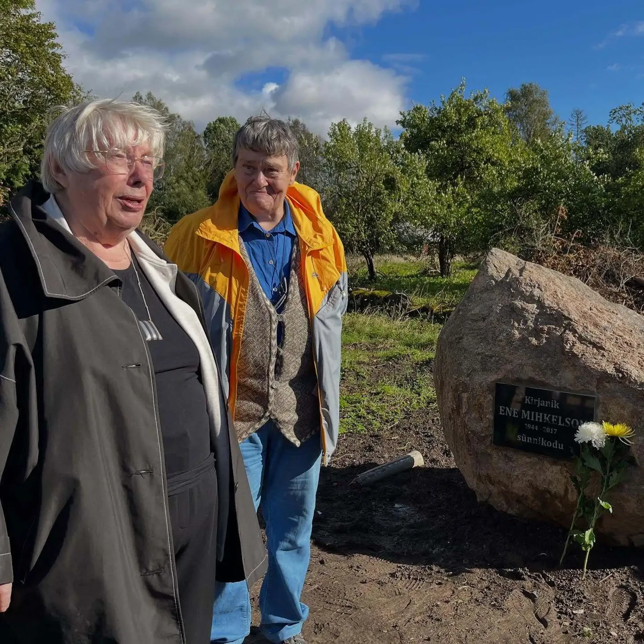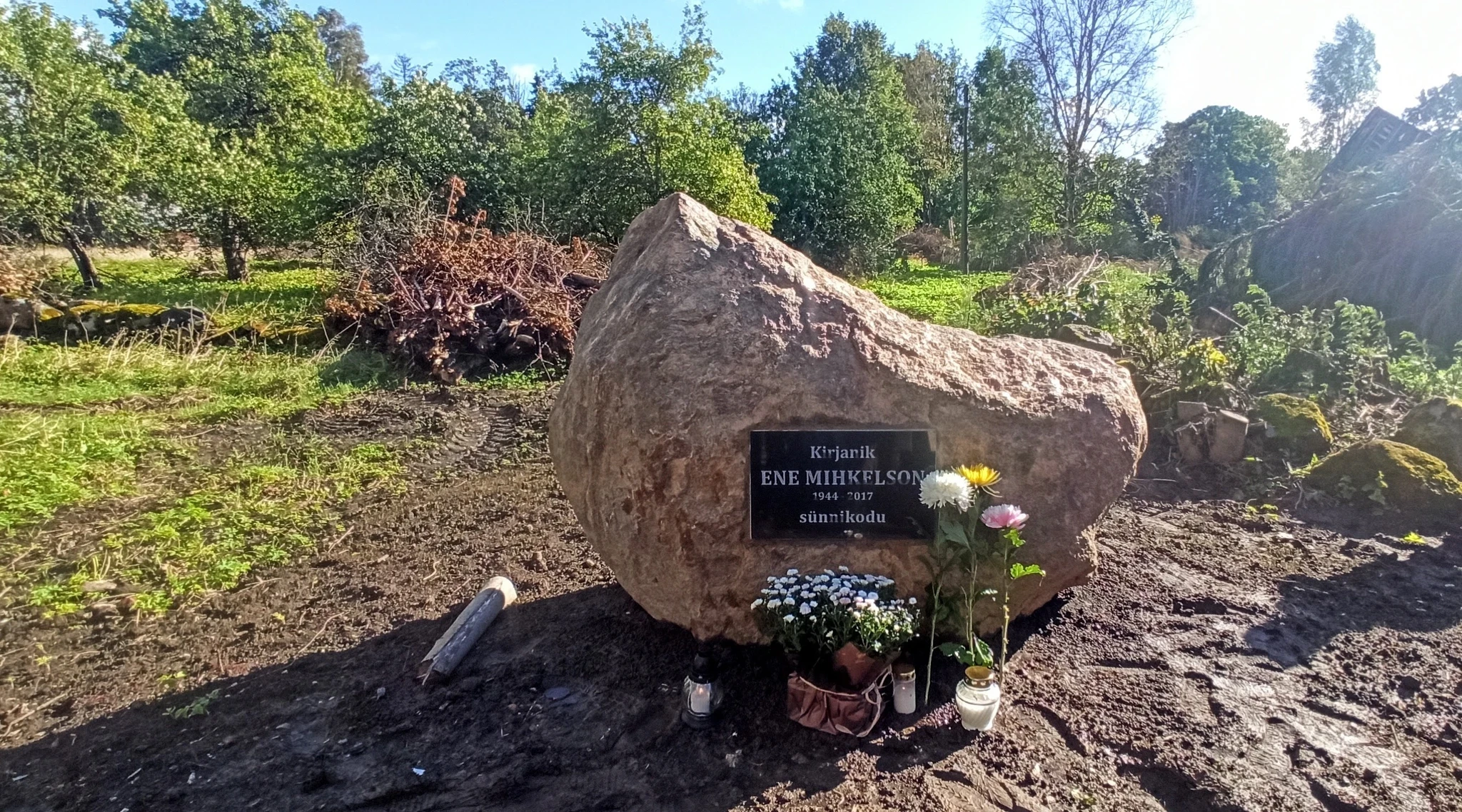 Ene Mihkelsoni sünnikoha varemete juures, mis kuuluvad Aarne Kuusele. Kivi aitas oma kohale toimetada Arvet Kutsar